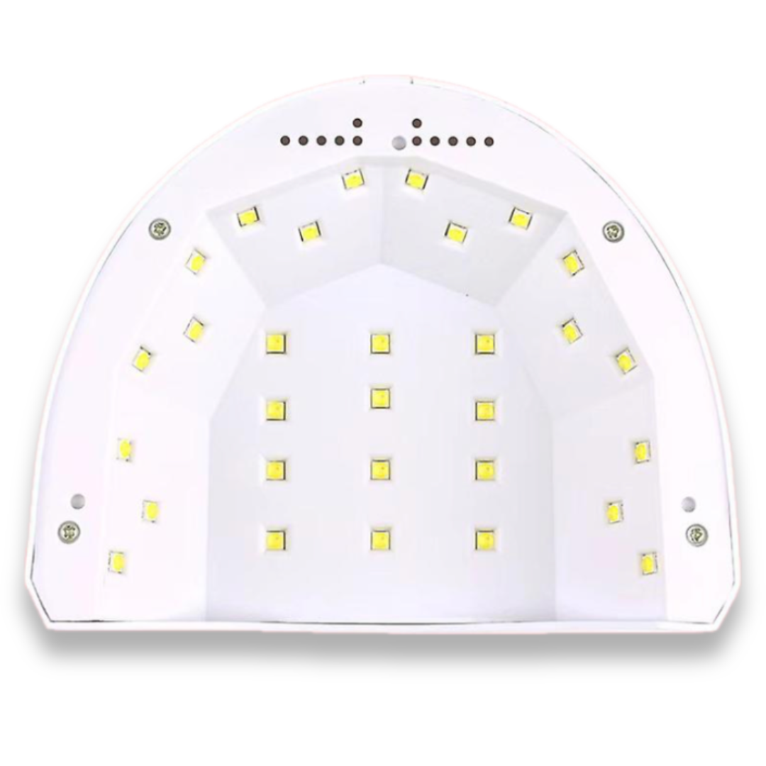 Lámpara led para el secado profesional de uñas, potencia de 48W. -Pulsando el botón de encendido y apagado durante 2 segundos cambia a 24W -Su tecnología de luz doble abarca una banda de luz ultravioleta mas amplia.Adecuada para todo tipo de producto, tantos geles constructores, esmaltes, pegamentos, finishers… -3 modos de tiempo